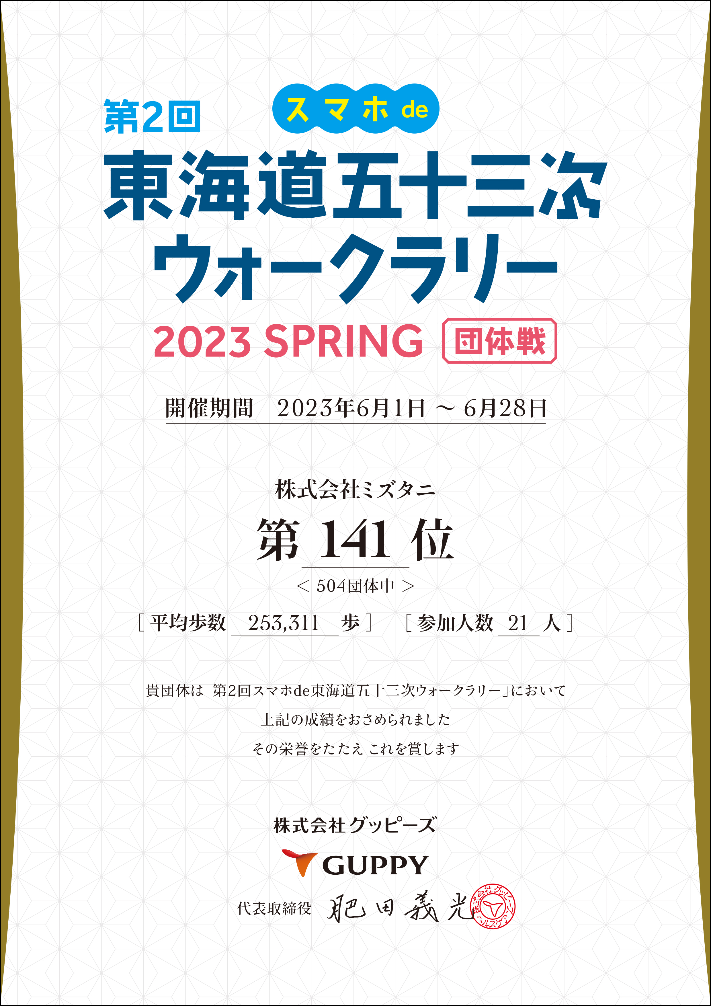 弊社は、2023 年 6 月 1 日~28 日に開催された、第 2 回スマホ de 東海道五十三次ウォークラリーにおいて、 28 日間の平均累計歩数253,311歩を記録し、504 団体中141位を受賞いたしました。
